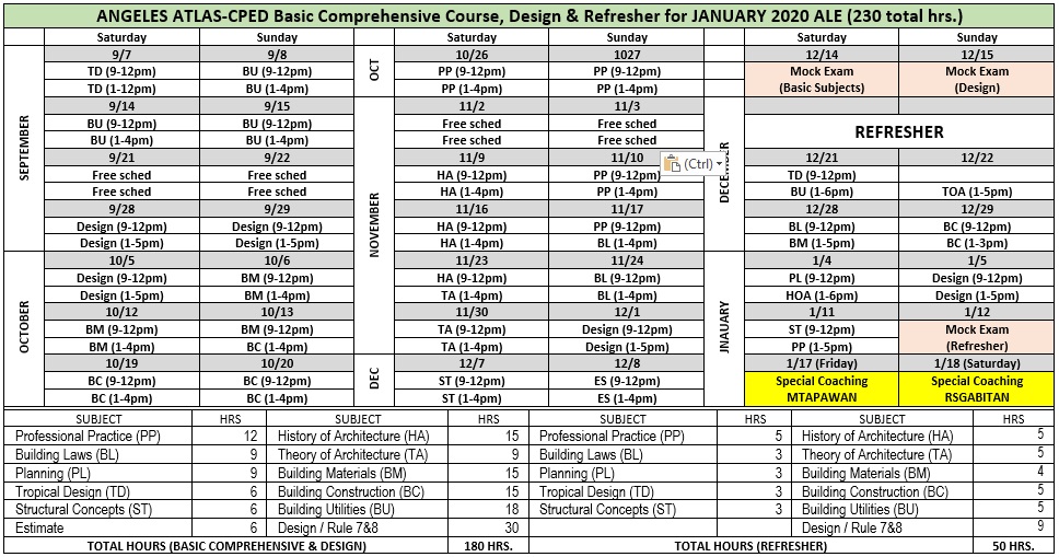 ATLAS-CDC Review Center (formerly ATLAS-CPED) Angeles City announces the schedule for the review classes for the Architecture Board Exams for JANUARY 2020. The review classes consist of the basic review (comprehensive consisting of all subjects in the exam), design review (with focus on Rule 7&8 of the NBCP and estimating), and the refresher class (consisting of review of common questions given in the board exams for all subjects). Early Bird Discounts and Discounts for Honor Graduates, UAPGA officers and members are available.