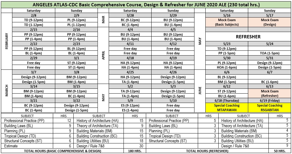 ATLAS-CDC Review Center Angeles City announces the schedule for the review classes for the Architecture Board Exams for JUNE 2020. The review classes consist of the basic review (comprehensive consisting of all subjects in the exam), design review (with focus on Rule 7&8 of the NBCP and estimating), and the refresher class (consisting of review of common questions given in the board exams for all subjects). Early Bird Discounts and Discounts for Honor Graduates, UAPGA/UAPSA/ASAPhil/JrPIA officers and members are available. We also have a special rate for retakers.